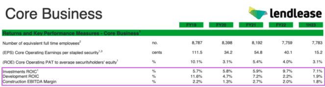 In his presentation, Mawhinney called out Lendlease's ambitions of improving its return on invested capital (ROIC) — 10% to 13% for developments and 6% to 9% for investments. Likewise, the company is targeting a 2% to 3% EBITDA margin for construction. This would all equate to an 8% to 10% margin in aggregate.