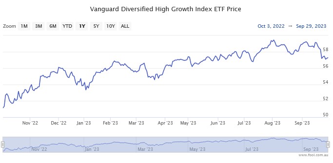 Despite a recent dip, the Vanguard Diversified High Growth ETF is still in the green over 2023 so far, with a year-to-date gain of 5.64%. That rises to an even healthier 11.4% over the past 12 months, as you can see below: