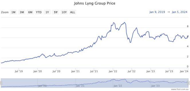 Johns Lyng has added 523% to its share price over the same period, equating to a 44% CAGR.