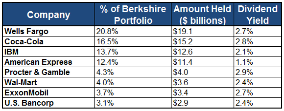 Two of Berkshire's most recent and notable investments — IBM (NYSE: IBM ) and ExxonMobil (NYSE: XOM ) — have two of the highest dividend yields on the list. Berkshire also holds the exclusive $5 billion stake in Bank of America (NYSE: BAC) preferred shares that carry an annual dividend of 6%. If you take those eight investments, plus the Bank of America position, Berkshire rakes in roughly US$2 billion each year in the form of dividends from other companies.