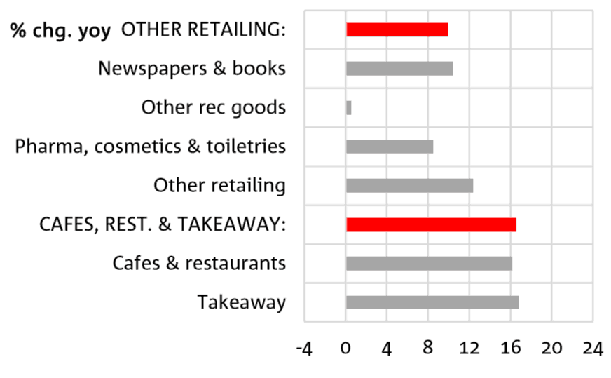 However, the monthly cashless retail sales index compiled by National Australia Bank Ltd. (ASX: NAB) showed that "Cafes, restaurants and takeaway" is the fastest-growing category with the takeaway component leading the charge.