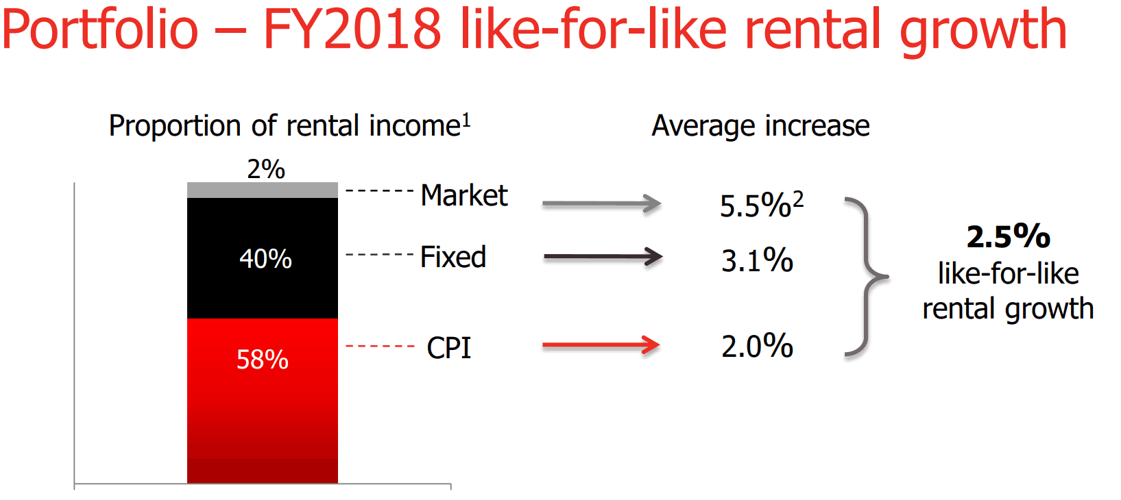 As the chart below shows, 58% of of the Trust's rental income is subject to CPI related annual increases, while 40% of its rental income is subject to fixed increases of 3.1%. Only 2% of the income is subject to market related increases (currently at 5%).