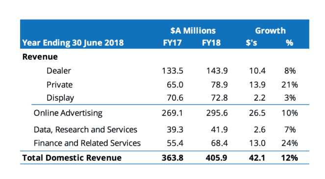 The majority of Carsales' revenue continues to be generated in the Australian market. Domestic revenue rose 12% in FY 2018 to $405.9 million. Strong growth in Private advertising was a key driver of the solid performance, as shown below.