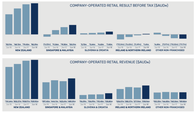 As was largely expected, Harvey Norman delivered a soft result in FY 2018. This was despite a strong performance from its company-operated offshore retail operations. As shown below, its company-operated offshore retail operations performed well across the board and grew profit by 15.1% to $116.1 million.