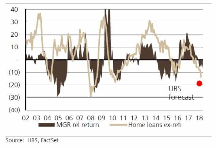 What's interesting is that UBS found a correlation between Mirvac's relative return and home loan growth (excluding refinance). Credit growth is slowing and most experts believe it will fall further as house prices come under increasing pressure.