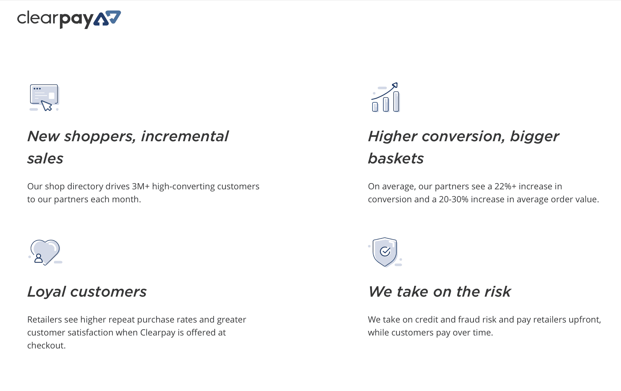 Below we can see a screenshot of its Clearpay website's pitch to get retailers to sign up to its services in the UK.