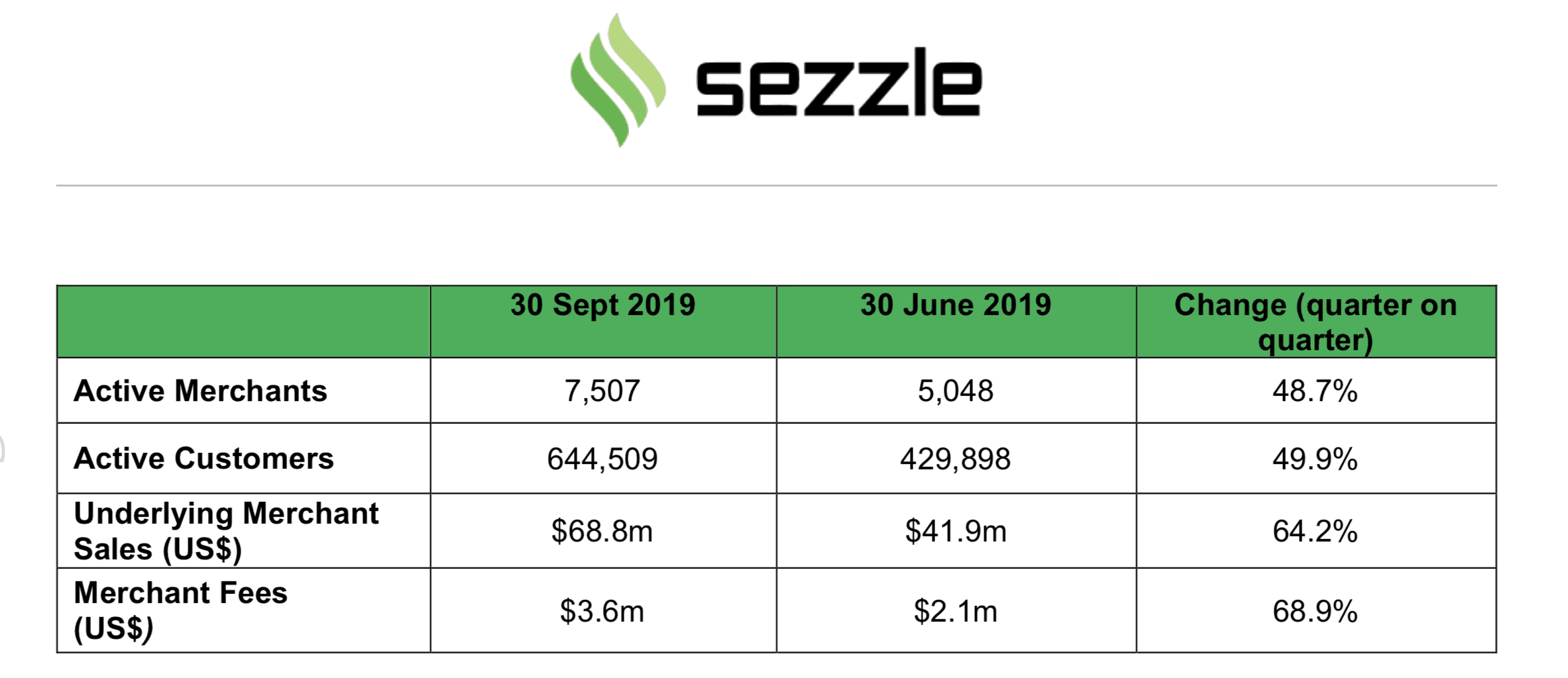 The Sezzle Ltd (ASX: SZL) share price is up 3.4% to $2.76 today after the buy-now-pay-later reported cash flows and operating metrics for the quarter ending September 30 2019. As a US-based operator Sezzle is targeting the less mature, but far larger U.S. consumer market and the table below speaks for itself on the headline numbers.