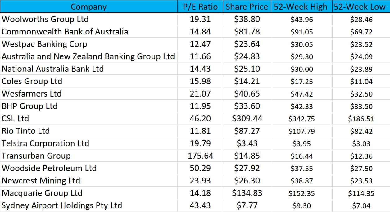What's more striking is how most of the ASX blue chips are looking as we start the new week. Take a look at the table below and note the current share prices relative to their 52-week highs (and lows).