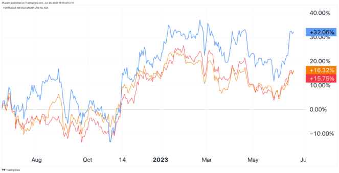 In turn, shareholders have rewarded these greater margins. The Fortescue share price has rallied 32% in the past 12 months, compared to 16% and 15% gains from BHP and Rio Tinto respectively, as shown above.
