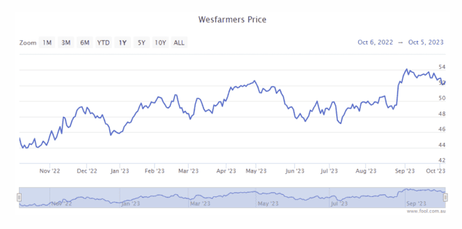 On Friday, Wesfarmers shares closed down 1.75 at $51.65 apiece. That's a 4.10% drop over the past month, as you can see on the chart below.