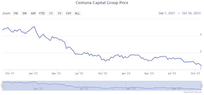 Since the start of 2023, the Centuria share price has fallen 31% and it's down by close to 70% from September 2021, as we can see on the chart below.