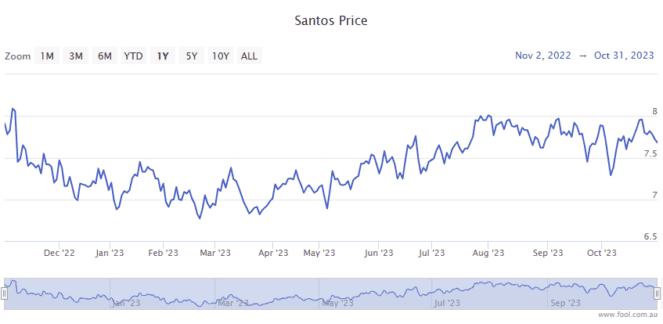 Shares in the S&P/ASX 200 Index (ASX: XJO) oil and gas stock were trading almost flat at $7.73 before plunging to $7.52 apiece. At the time of writing, shares have regained some ground, trading for $7.53 which leaves the Santos share price down 2.71%.