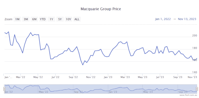 The Macquarie Group Ltd (ASX: MQG) share price has just hit a 52-week low of below $159. The ASX financial share has fallen in tough times, down around 20% since February 2023 and it has dropped 25% from January 2022, as we can see on the chart below.