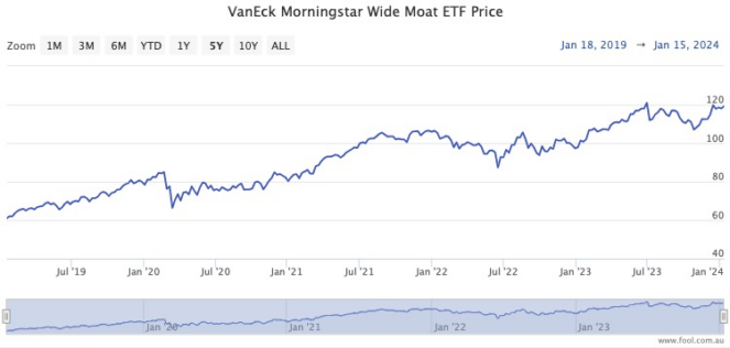 Wide Moat ETF in some years has also paid out a small dividend. The dividend yield has averaged out to be 2.4%, while last year it was as high as 8.8%.