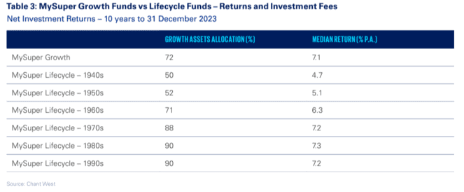 The following table published in the KPMG report uses Chant West data showing net investment returns per annum over the 10 years to 31 December 2023.